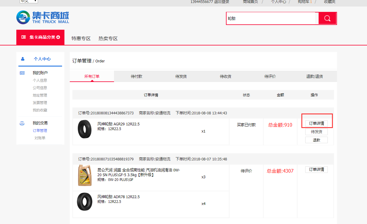 1、点击个人中心,点击左侧的订单管理,之后点击订单详情。(如下图)